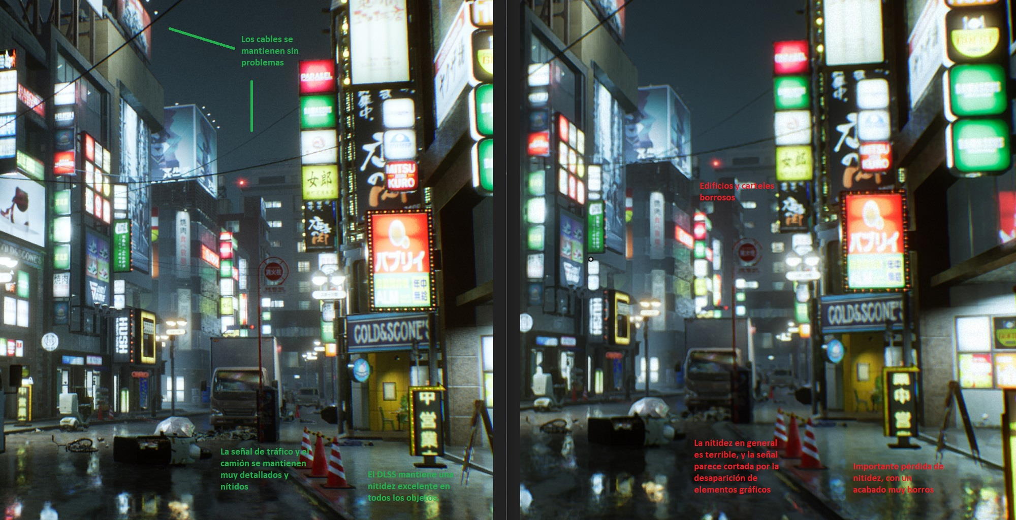 Ghostwire Tokyo: comparativa DLSS frente a FSR, ambos en modo rendimiento. Clic para ampliar.