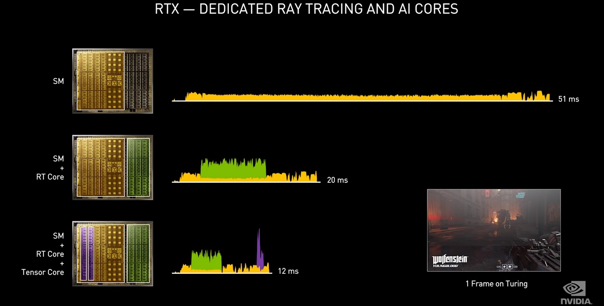 NVIDIA fue la primera en apostar por la implementación del trazado de rayos en juegos, y por la aceleración de esta tecnología mediante GPU. Sus primeras tarjetas gráficas compatibles con esta tecnología, y con núcleos RT, fueron presentadas en 2018 (las GeForce RTX 20), mientras que AMD no dio este paso hasta 2020, fecha en la que presentó las Radeon RX 6000.