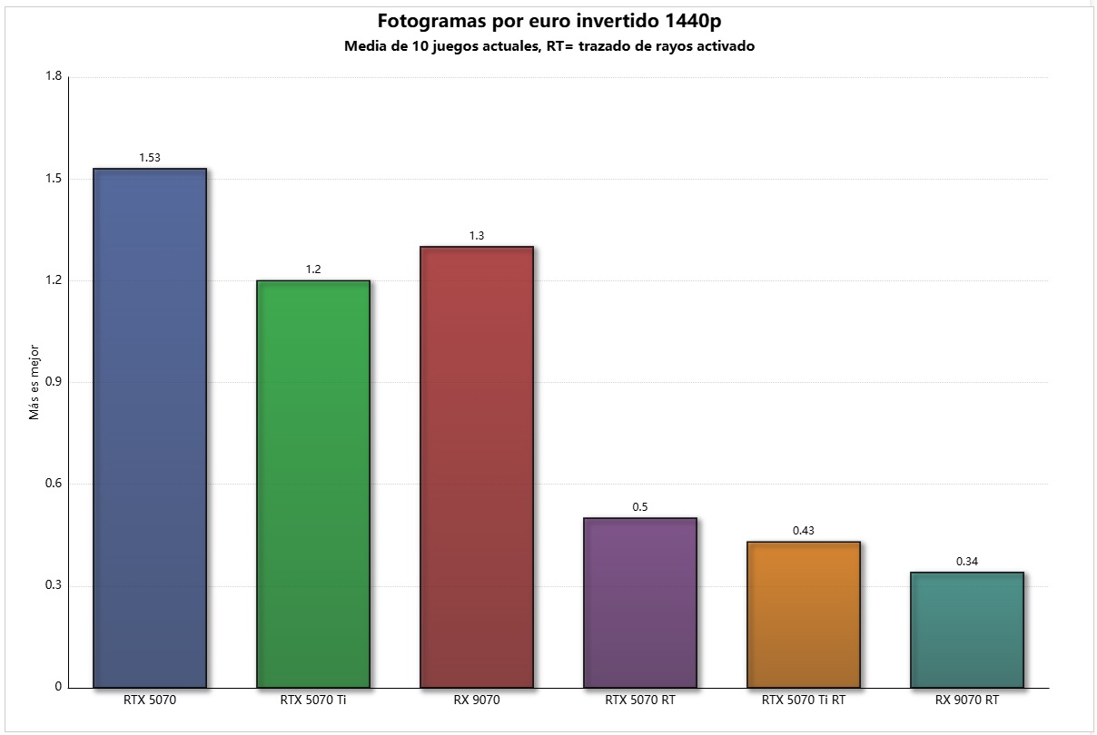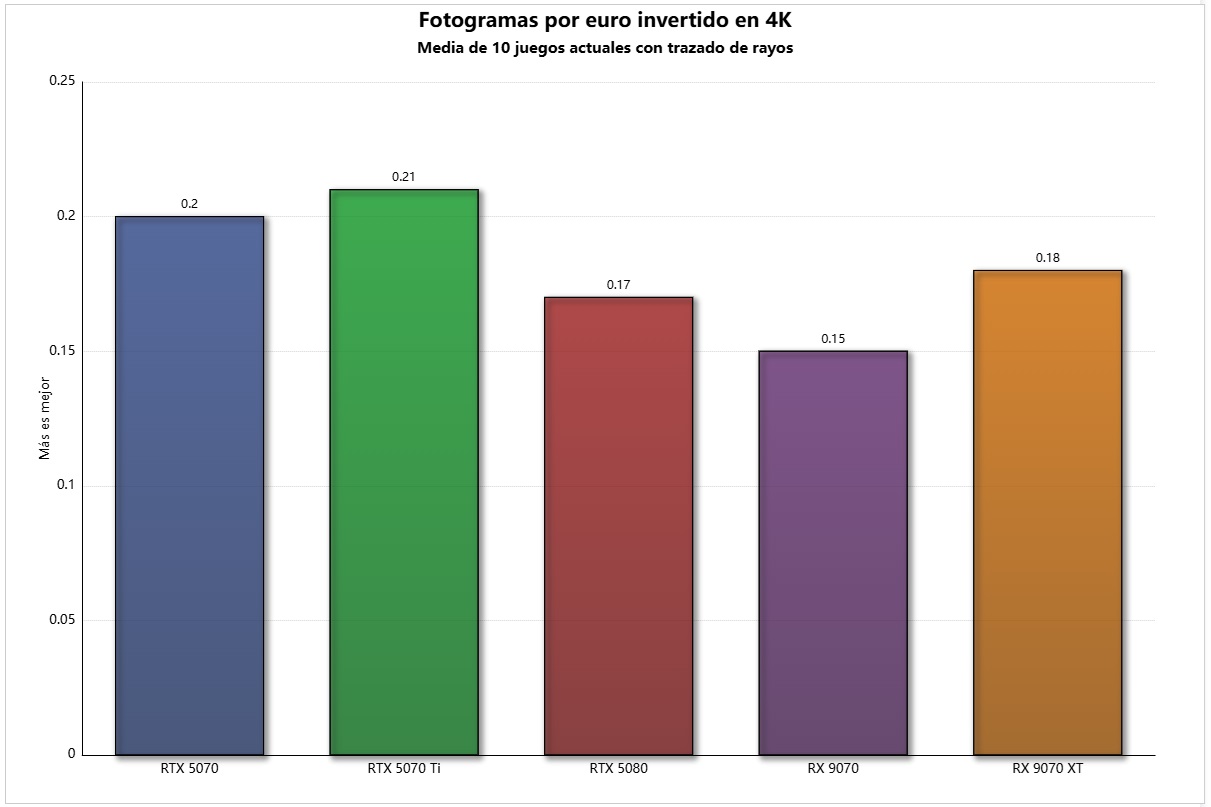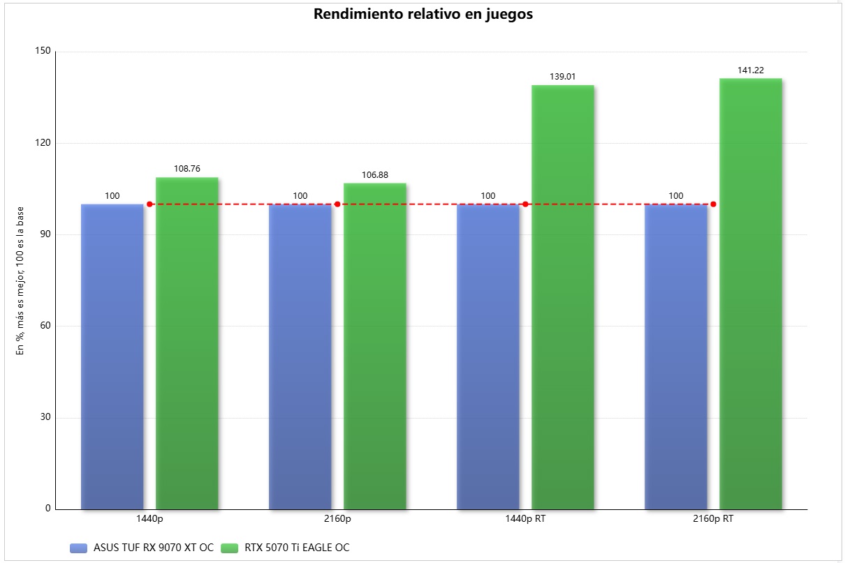 - GeForce RTX 5070 Ti: es un poco más rápida que la Radeon RX 9070 XT.