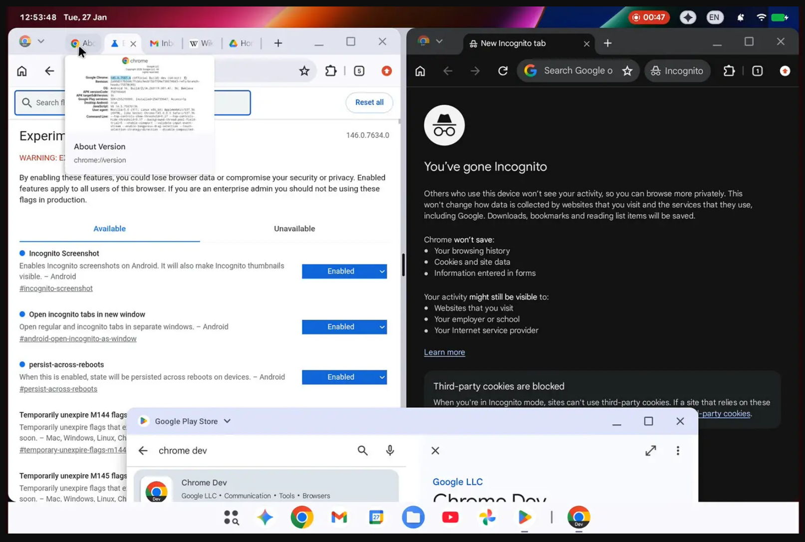 La barra de tareas a continuación tiene navegación fija y los controles centrados tipo iniciador agregan un toque similar al de Windows. No abandonar por completo el ADN de ChromeOS. El diseño visual prioriza la usabilidad y muestra características que Google considera imprescindibles para las PC con Android: controles de ventana similares a los de un escritorio, multitarea en pantalla dividida y configuraciones de Chrome que se parecen más a la navegación de escritorio que a lo que normalmente ofrece Android en pantalla grande.