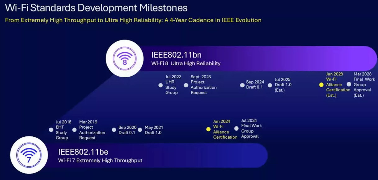 Si se está desarrollando Wi-Fi 7 para lograr Rendimiento extremadamente alto El propósito de (EHT) es obtener la capacidad de construir redes inalámbricas locales con suficiente funcionalidad para reemplazar las redes cableadas. Para Wi-Fi 8, los responsables del estándar han establecido lo que llaman UHR (Fiabilidad ultraalta alguien Fiabilidad ultraalta) mejora las métricas relevantes para dispositivos compatibles en un 25 %: un 25 % más de rendimiento real en condiciones de uso típicas, un 25 % menos de latencia máxima y una reducción similar en la pérdida de paquetes cuando se itinera entre puntos de acceso.
