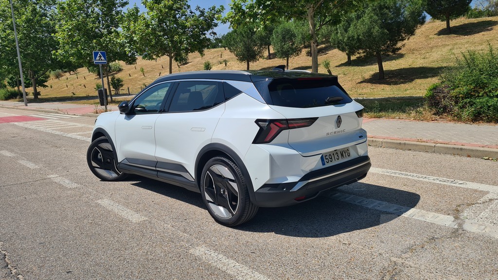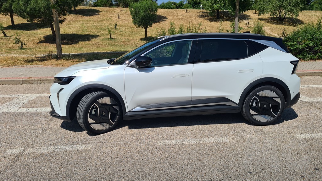 La vista lateral revela un equilibrio interesante entre las proporciones de un SUV y la eficiencia aerodinámica de una berlina, un equilibrio de diseño con el que parece que los responsables de la marca francesa se propusieran enviar el mensaje de que este es un nuevo Scenic. A pesar de montar unas enormes llantas de 20 pulgadas con diseño aerodinámico en este acabado Iconic, la altura total del vehículo se contiene en 1,57 metros, una cota baja para su segmento que es clave para reducir la resistencia al aire y por lo tanto mejorar la atonomía. Destacan los tiradores de las puertas enrasados en la carrocería, que se despliegan automáticamente al acercarnos con la llave, y la línea de cintura alta que junto con el techo en contraste negro brillante aligera la silueta visual del conjunto.