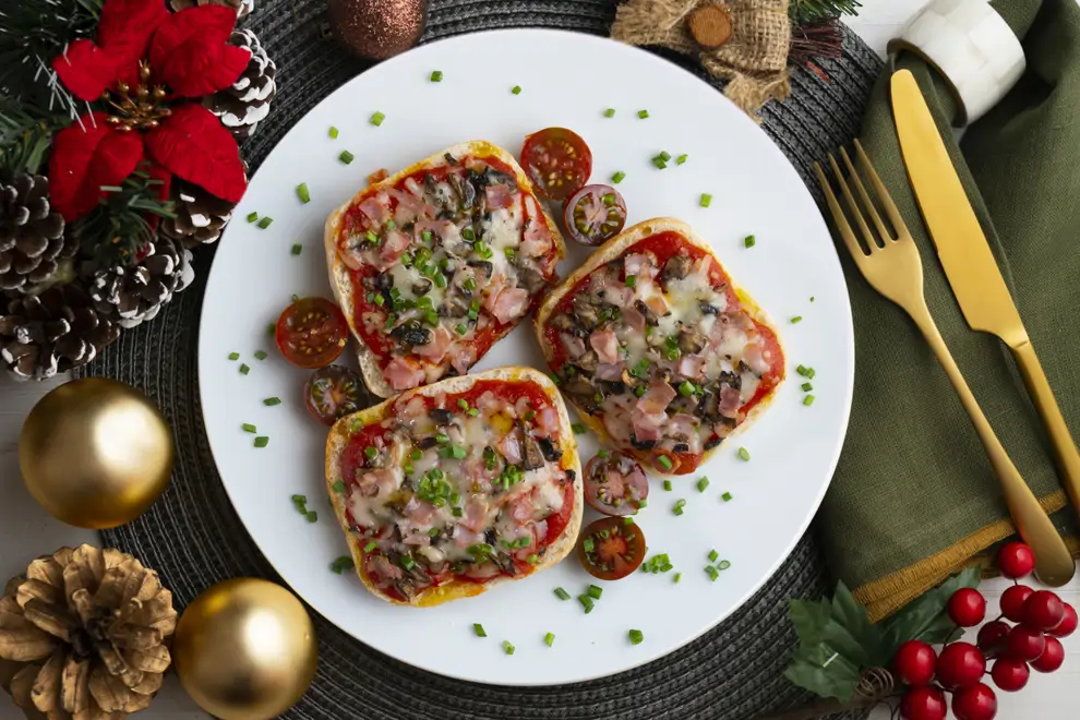 Las mini pizzas son un bocado lleno de sabor y picante, perfecto para la mesa navideña. El jamón York aporta proteínas ligeras y setas vitaminas del grupo B y potasio.