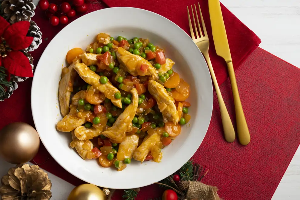 Estas tiras de pollo con verduras están aderezadas festivamente con un toque de jengibre y pimientos rojos que recuerdan los colores de la Navidad. El pollo aporta proteína magra y verduras, fibra y vitaminas, haciendo de este platillo una opción ligera y nutritiva para compartir en familia durante las fiestas.