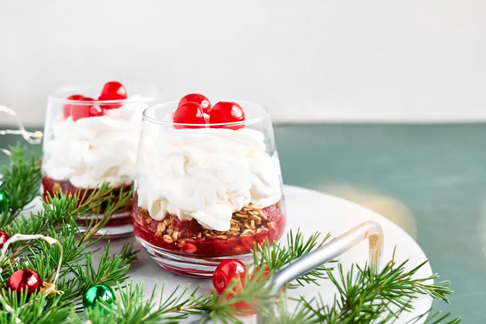 Este parfait combina el yogur griego con el dulzor de la compota de arándanos y el crujido de la granola, con un Toque navideño gracias a la canela y ralladura de naranja.