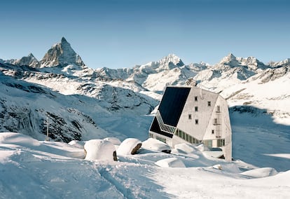 Junto a ella, aislada, se encuentra la carismática Neue Monte Rosa Hütte (2.883 metros), un refugio prácticamente autosuficiente del ETH, el prestigioso Instituto Federal Suizo de Tecnología de Zúrich, impulsado por el profesor Andrea Deplazes y desarrollado por sus alumnos, en colaboración con colaboradores estratégicos. Parece una roca y su revestimiento de aluminio la integra con el entorno. Su ubicación es cautivadora.