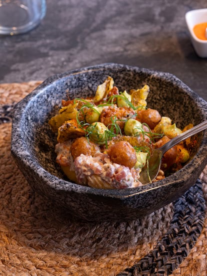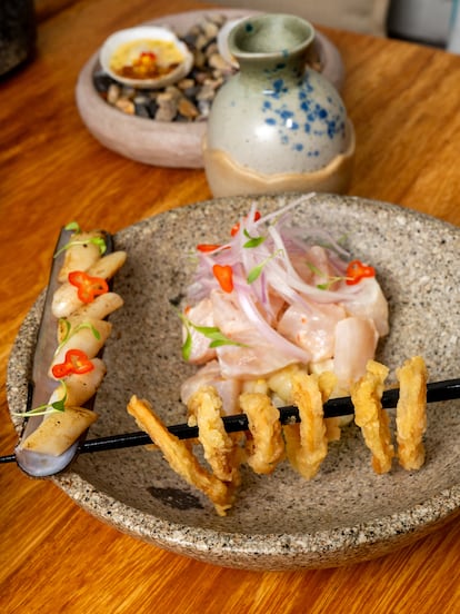 En Piedra entran un máximo de 40 personas. Inaugurado hace tres años entre talleres mecánicos y alejado del barrio donde se ubican la mayoría de los restaurantes de Surquillo. Aquí se come pescado y marisco de un menú degustación de ocho platos que cambia diariamente según los productos frescos que llegan. Sebastián Vega (Lima, 36), chef y empresario, reconoce que es complejo competir con restaurantes premiados: “Trato de ser el premio de consolación para los que vienen a Lima y no consiguen una reserva en Maido, que está lleno de turistas”, admite. Pese a ello, este premio de consolación le sienta bien y asegura que gracias a su propuesta la gente descubre otra cara de la cocina limeña y queda feliz. “Hay que aprovecharlo, es la manera de entrar en el turismo”, confía.