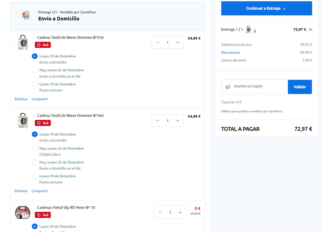 Por último, además de las cadenas de coches más tradicionales, también es posible adquirirlas en la web de Carrefour. pulverización. es el mejor barato y rápido, pero también el menos confiable. Se utiliza para hazlo, pero también es cierto que no se consideran una alternativa a las tradicionales cadenas para la nieve y no evitarían una multa.