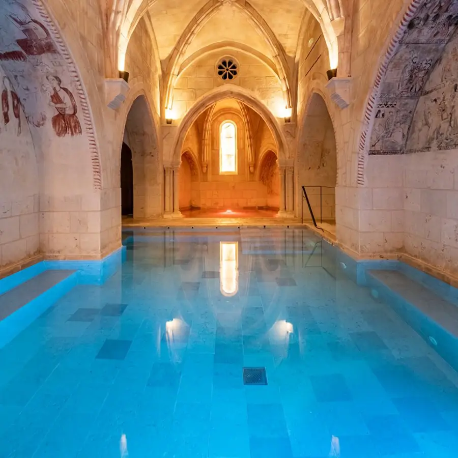 Las piscinas cubiertas están conectadas por un circuito termal que alterna temperaturas, chorros y contrastes, todo ello diseñado para revitalizar el cuerpo. Desde las ventanas, el visitante contempla los meandros del río Deva encajados entre los acantilados de las gargantas. Pero entre las experiencias que puedes vivir en el spa, la de noche nadando bajo un cielo estrellado En mi opinión no hay comparación.