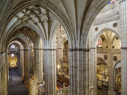 Mirando a la plaza de Anaya, en la entrada norte de la catedral, es fácil encontrar grupos de curiosos que buscan un astronauta o un dragón comiendo helado, pero el conjunto catedralicio, antiguo y nuevo, ofrece mucho más. Y Salamanca tiene dos catedrales unidas. La más antigua, de estilo románico, se empezó a construir en el siglo XII, y la nueva, de estilo gótico tardío, renacentista y barroco, se empezó a construir en 1513 y se terminó en la Churriguera del siglo XVIII. Del conjunto destacan las dos torres, emblema local. Puedes subir allí por 4 euros para ver la ciudad y el río Tormes.