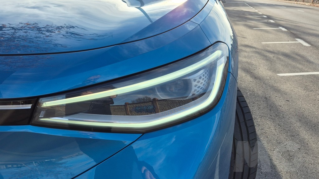La nariz del ID.4 es quizás el área que más claramente refleja la filosofía de diseño de Volkswagen para sus eléctricos. El frontal abandona la rejilla de ventilación tradicional, reemplazándola por un panel ciego que cierra el morro de forma limpia y mejora el coeficiente aerodinámico. Los faros de LED Matrix tienen un perfil muy alargado y estilizado, extendiéndose hacia los laterales del capó con una forma que recuerda a la mirada afilada de un felino. Entre ellos, una tira de luz diurna conecta ambos grupos ópticos en las versiones mejor equipadas, creando una firma luminosa de noche que resulta reconocible al instante. El logotipo de Volkswagen aparece iluminado en el centro de ese panel frontal cerrado, añadiendo un toque de presencia nocturna. El capó tiene un perfil relativamente largo para un SUV de este segmento, con líneas suaves que evitan cualquier estridencia visual. En conjunto, el frontal transmite modernidad sin esfuerzo.