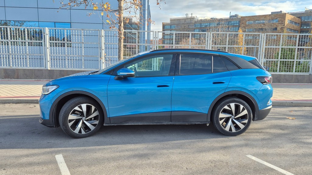 Visto de costado, el ID.4 muestra las proporciones propias de un SUV de segmento C con líneas muy fluidas. La altura de conducción es generosa pero no exagerada, y la línea de cintura elevada junto a las ventanillas de tamaño moderado dan al coche un aspecto sólido y musculoso. Una línea de carácter arranca desde el arco del paso de rueda delantero y recorre el lateral hasta fundirse con los pilotos traseros, añadiendo dinamismo a un perfil que podría resultar demasiado ordenado sin ese recurso estilístico. Los pasos de rueda tienen un tratamiento plástico pronunciado que subraya la anchura del coche y le aporta un carácter todocamino discreto. La longitud total de 4.584 mm y la batalla de 2.771 mm son datos que posicionan al ID.4 en la parte alta del segmento C, casi rozando el D, lo que se traduce en una silueta de proporciones muy equilibradas. Las llantas de aleación de 19 pulgadas de serie en la versión Pro, con la opción de pasar a las de 20 o 21 pulgadas, completan un lateral que no dejará a nadie indiferente aunque tampoco generará adhesiones incondicionales.