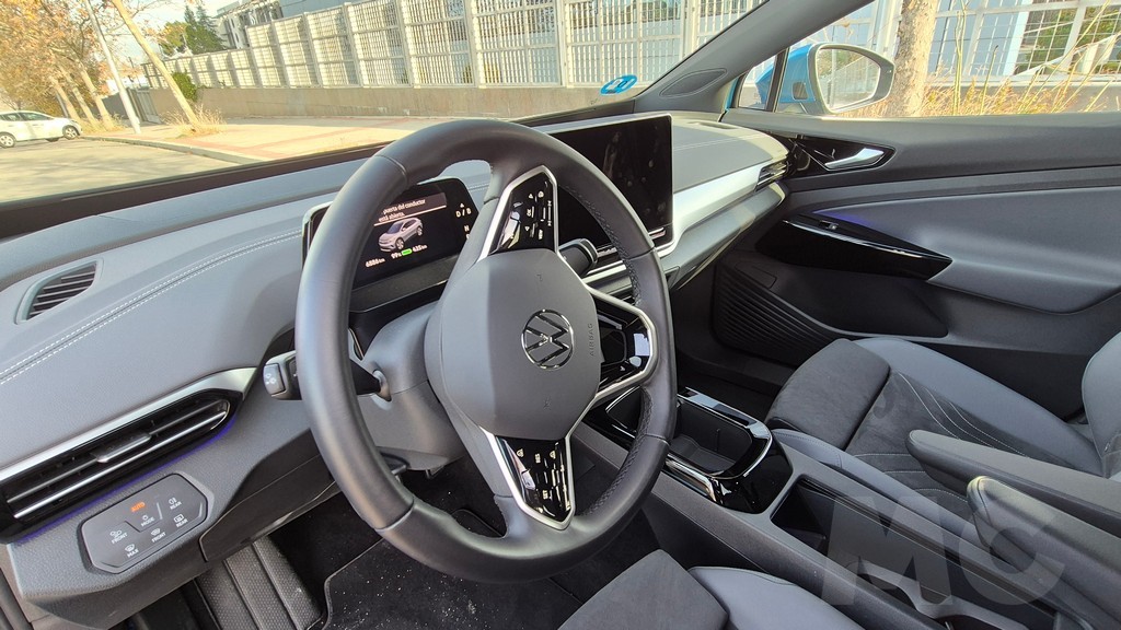 Al entrar en el habitáculo del ID.4 la primera impresión es de amplitud. El salpicadero sigue el concepto One Space de Volkswagen para sus eléctricos, con una disposición limpia y horizontal en la que la pantalla central domina el conjunto. Los materiales generan una percepción ambivalente. Por un lado, las superficies que el conductor y el acompañante tocan con más frecuencia, como el volante forrado en cuero, los mandos de las puertas y los apoyabrazos, tienen una calidad táctil satisfactoria. Por otro, las zonas inferiores del salpicadero y algunos paneles laterales recurren a plásticos duros que resultan incongruentes con el precio del coche.