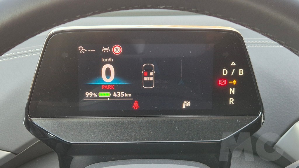 El cuadro de instrumentos es un pequeño panel digital de 5,3 pulgadas situado en lo alto de la columna de dirección. Es una solución discutida porque su tamaño es limitado y su posición requiere que el conductor eleve ligeramente la vista desde la carretera para consultarlo. VW lo complementa con un Head-Up Display opcional que proyecta la información más relevante sobre el parabrisas, incluyendo funciones de realidad aumentada que superponen flechas de navegación sobre la imagen de la carretera. También está presente la tira luminosa denominada ID. Light, una franja de luz en la base del parabrisas que cambia de color e intensidad para comunicar información básica al conductor: carga en progreso, activación de sistemas de asistencia, advertencias de navegación.