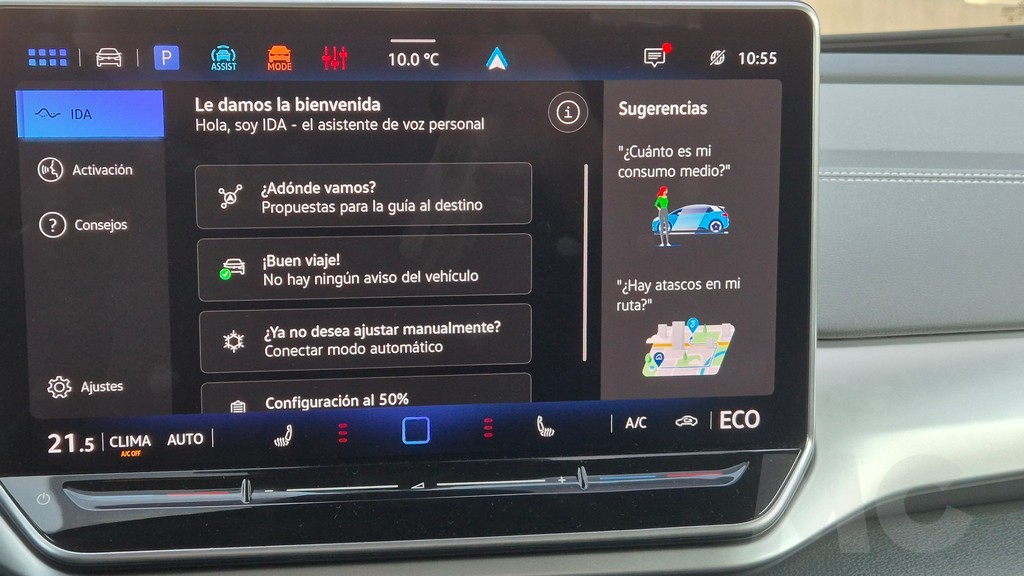 El ID.4 viene equipado de serie en la versión Pro con un conjunto completo de sistemas de asistencia que Volkswagen agrupa bajo la denominación IQ.Drive. El control de crucero adaptativo con función de parada y arranque en atascos funciona de forma fluida y es capaz de mantener la distancia con el vehículo precedente en autopista con una naturalidad que contribuye a reducir la fatiga en trayectos largos. El asistente de mantenimiento de carril actúa sin brusquedades aunque es algo pasivo a la hora de corregir desviaciones. El aviso de punto ciego en los retrovisores resulta muy útil en los cambios de carril en autopistas de varios carriles. Los sensores de aparcamiento delanteros y traseros y la cámara trasera facilitan las maniobras urbanas en un coche de casi 1,85 metros de ancho. El sistema de frenado de emergencia autónomo con detección de peatones y ciclistas funciona con eficacia. El reconocimiento de señales de tráfico con aviso al conductor completa un conjunto que se sitúa a la altura de lo que ofrecen sus principales rivales en el segmento.