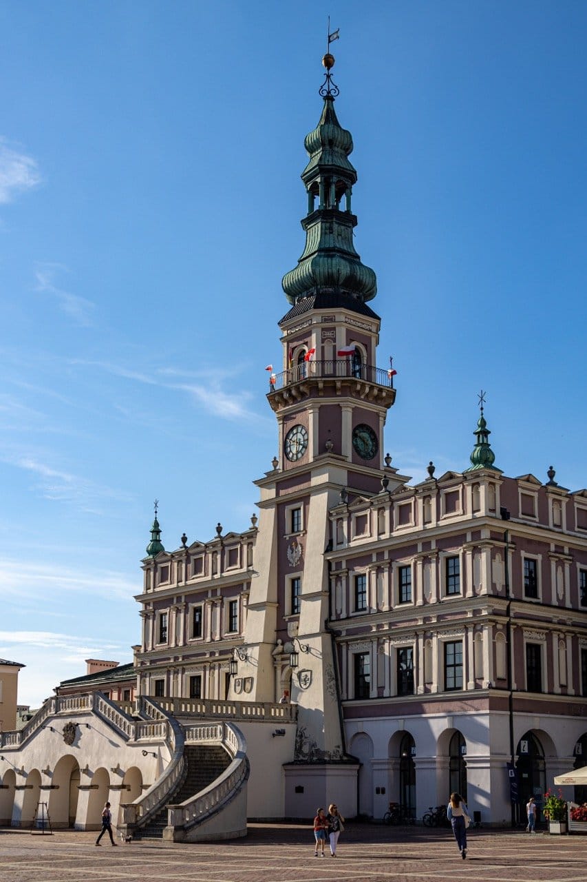 Acostumbrados como estamos a las castizas casas consistoriales hispánicas o los rigurosos town halls anglosajones, el ayuntamiento de Zamość sorprende por su escenografía: una monumental escalera doble en forma de abanico que, en realidad, fue añadida en el XVIII, en plena fiebre del Barroco. Y es que no hay que olvidar que la ciudad ideal del Renacimiento polaco tiene mucho de barroca por los sucesivos añadidos que fue recibiendo las décadas posteriores a su fundación.
